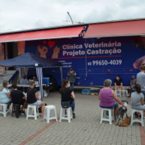 A castração começou às 7h30 e, em pouco tempo, a estrutura móvel da clínica, contratada pela Funat por meio de credenciamento, encheu de famílias que se cadastraram nos últimos meses para castrar os pets, sem custos.