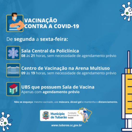 Destaca-se que as pessoas que ainda não receberam nenhuma das doses do imunizante e estão no prazo, devem se dirigir até uma Unidade Básica de Saúde (UBS) para receber a vacina, perante agendamento prévio (clique aqui). A aplicação também pode ser realizada de segunda a sexta-feira na sala central da Policlínica, das 08 às 21 horas, e no Centro de Vacinação implantado na Arena Multiuso Estêner Soratto da Silva, das 09 às 19 horas.