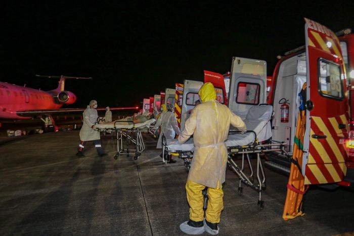 No pátio da base da Força Aérea Brasileira (FAB), em Florianópolis, 11 ambulâncias de suporte básico e avançado estavam preparadas para fazer o transporte dos pacientes até os hospitais. Foto: Maurício Vieira/ Secom A chegada a Santa Catarina por volta das 02h25 da madrugada deste domingo, 31, renova a esperança de 11 pacientes de Manaus que vão continuar o tratamento da Covid-19 no Estado. Depois de cinco horas de voo, o jato executivo da Força Aérea Brasileira (FAB) pousou em Florianópolis. E, no pátio da Base Aérea, teve início a operação de transporte dos pacientes para os hospitais Nereu Ramos e Universitário Professor Polydoro Ernani de São Thiago, na Capital.