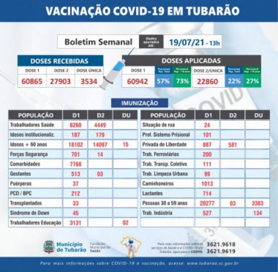 Tubarão imunizou com a primeira dose 57% da população total e 73% da população vacinável (maiores de 18 anos). O boletim atualizado da vacinação contra a Covid-19 em Tubarão foi divulgado, pela coordenação de Imunização da Fundação Municipal de Saúde (FMS), ontem. No total, Tubarão imunizou com a primeira dose 57% da população total e 73% da população vacinável (maiores de 18 anos).