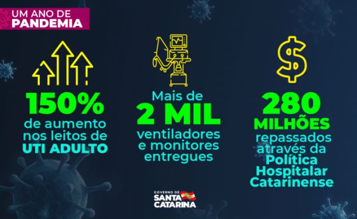 Saúde Catarinense. Foto: Governo de Santa Catarina O Governo de Santa Catarina aumentou em 150% o número de leitos de UTI adulto desde o início da pandemia da Covid-19. Em março de 2020, a rede hospitalar catarinense contava com 546 leitos de terapia intensiva adulto e atualmente soma 1.358. O Estado também atuou na distribuição de equipamentos para as unidades de saúde. Foram entregues mais de dois mil ventiladores e monitores para apoiar no tratamento dos pacientes, além de aplicar, por meio da Política Hospitalar Catarinense, cerca de R$ 280 milhões no custeio e manutenção dos serviços.