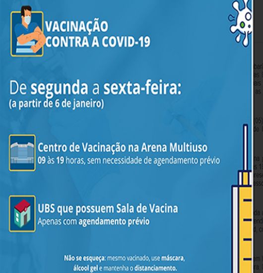 A partir desta quinta-feira (06), a vacinação contra a Covid-19 em Tubarão será realizada apenas na Arena Multiuso Prefeito Estêner Soratto da Silva, das 9 às 19 horas,de segunda a sexta. Na Policlínica Central serão aplicadas as demais vacinas existentes, contra outras enfermidades. Nas Unidades Básicas de Saúde as vacinas contra a Covid-19 serão aplicadas exclusivamente por agendamento prévio.