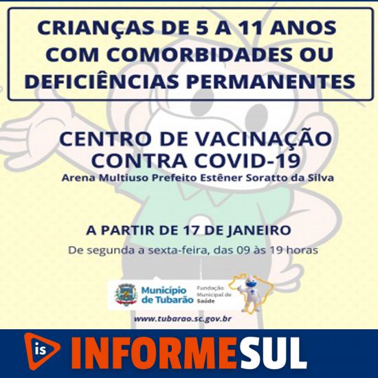 Segundo o IBGE, Tubarão possui 8.490 crianças nesta faixa etária. Chegaram à cidade 480 doses nesta primeira remessa. Foto: Divulgação Com o avanço da vacinação contra a Covid-19, torna-se necessária a ampliação de grupos a receberem o imunizante, a fim de evitar a disseminação do vírus. Levando este fato em consideração, fica estabelecido pela Fundação Municipal de Saúde (FMS), que na próxima segunda-feira (17), as crianças de 5 a 11 anos que possuem comorbidades ou deficiências permanentes, poderão receber o imunizante.