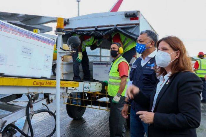 As vacinas já começaram a ser entregues às regionais para seguir os cronogramas de vacinação. Foto: Doia Cercal / Secom Chegou ao aeroporto da capital catarinense nesta quinta-feira, 8, por volta das 8h30, uma nova remessa com 144,7 mil doses da vacina contra a Covid-19. O novo lote foi recebido pela secretária de Estado da Saúde, Carmen Zanotto. São 75,5 mil doses da vacina Astrazeneca/Fiocruz e 69,2 mil da Sinovac/Butantan. Os imunizantes serão utilizados para a aplicação da Dose 1 e 2 e a distribuição para as centrais regionais será feita ainda nesta quinta, 8, a partir das 13h.