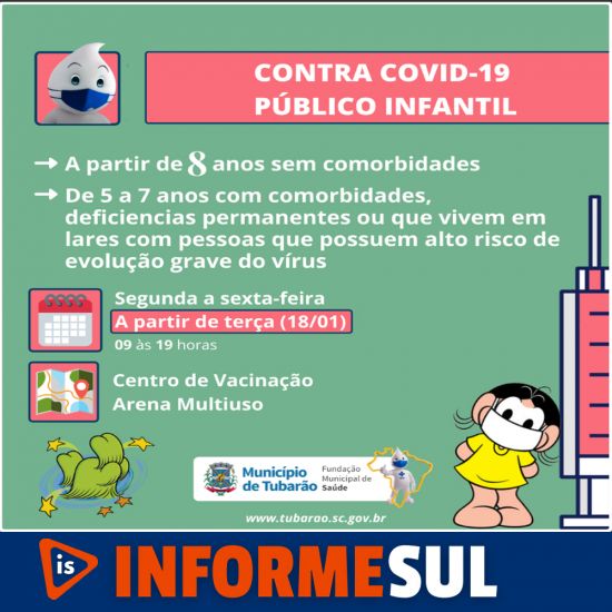 Após a confirmação de que nesta terça-feira (18), mais um quantitativo de doses da vacina contra a Covid-19 chegará no município, a ampliação de faixa etária foi determinada, e as crianças de 8 anos ou mais já podem receber o imunizante. A vacinação para crianças teve início nesta segunda-feira (17) e até terça (18) o meio dia, 187 crianças receberam a primeira dose.