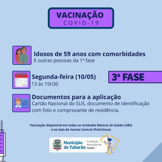 A partir de hoje inicia a fase 3, com pessoas de 59 anos e com comorbidades. Nesta etapa, é importante ressaltar que a vacinação não será mais centralizada no estacionamento do Farol Shopping, como a etapa anterior. Desta vez, a vacina estará disponível em todas as Unidades Básicas de Saúde (UBS) e na Sala de Vacina Central (Policlínica), das 13 às 15 horas.