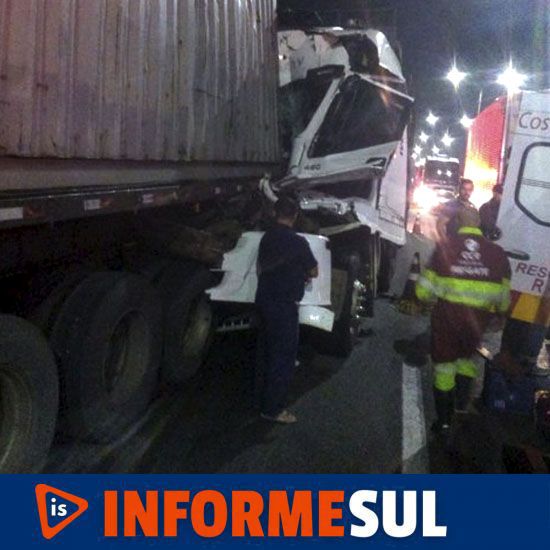 Uma colisão entre caminhões tratores na BR-101 de Imbituba deixou um homem ferido por volta das 23:45 horas dessa segunda-feira (5). O acidente aconteceu na altura do Alto Arroio, envolvendo os seguintes veículos: um caminhão Scania, com um motorista de 58 anos que não sofreu lesões e recusou ser conduzido ao hospital, e um outro caminhão Iveco, dirigido por um homem de 42 anos.