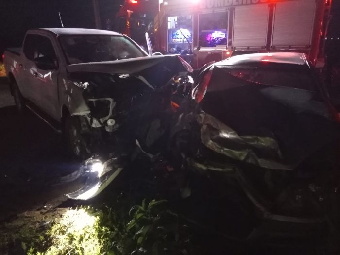 O acidente envolveu um veículo e uma camionete, em uma colisão frontal. Foto: Bombeiros O Corpo de Bombeiros Militar de Braço do Norte atendeu uma ocorrência de acidente de trânsito na rodovia SC 108, próximo a Empresa Doces Áurea. Uma colisão frontal envolveu um Vectra prata e uma Camionete Nissan Frontier branca, as placas dos veículos não foram divulgadas.