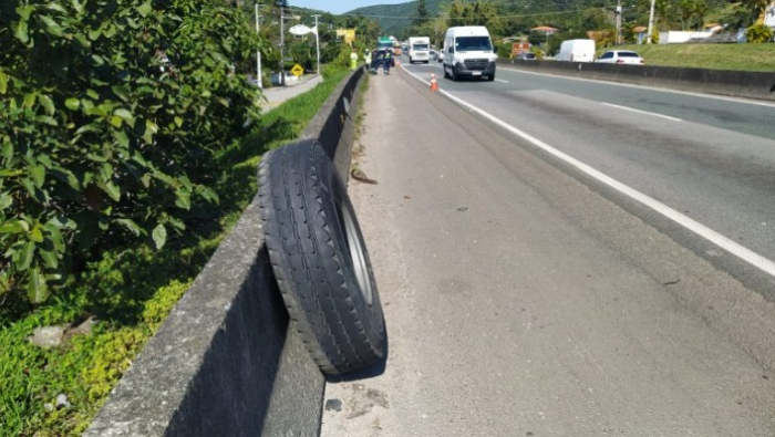A vítima, um homem de aproximadamente 30 anos, não resistiu aos ferimentos – Foto: PRF/ Divulgação/ ND Uma tragédia abalou a manhã desta segunda-feira, 28, na BR-101 em Biguaçu, na região da Grande Florianópolis. Um homem perdeu a vida após ser atingido por um pneu que se desprendeu de um caminhão guindaste em movimento.
