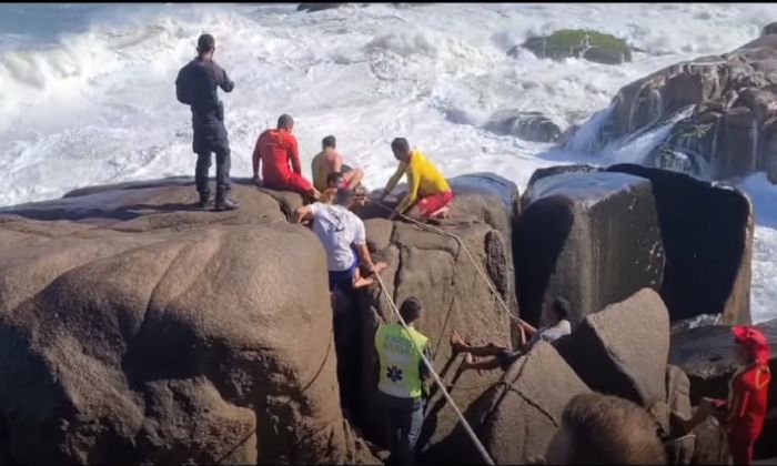 O resgate foi demorado devido ao local onde ela se encontrava. Foto: Bombeiros Ontem o Corpo de Bombeiros Militar de Laguna atendeu uma ocorrência de resgate no Costão na Prainha do Farol de Santa Marta. Um mulher de 23 anos que caminhava pelo costão, e durante a caminhada teve sua perna presa em uma fenda entre as rochas. Um rapaz que estava junto com a vítima, jogou- se no mar com intensão de pedir ajuda, e conseguiu nadar até a praia do mar do Cardoso, onde os guarda-vidas o avistaram, em seguida foi resgatado pelo jet ski do Corpo de Bombeiros.