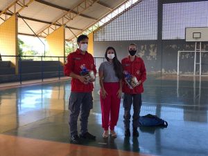 Alunos aprenderam as noções na prática com o auxílio dos bombeiros. Foto: BVJ Bombeiros Voluntários, o Sub Chefe de Socorro Fernando e a Bombeira Voluntária Darela realizaram uma palestra no Centro Educacional de Ensino João Manoel de Souza na cidade de Sangão.