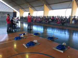 Na palestra foram abordados assuntos como: RCP (ressuscitação cardiopulmonar), OVACE (Obstrução de vias aéreas por corpo estranho), fraturas, hemorragias, crise convulsiva entre outros.
