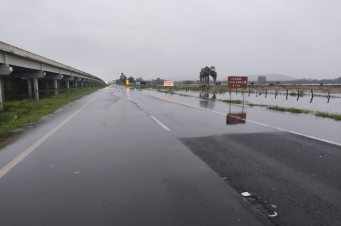 É a segunda vez nesta semana que o trecho é interditado pela PRF. – Foto: PRF/Divulgação/ND A BR-101, no km 403, sentido Norte, em Araranguá, Sul de Santa Catarina, foi novamente interrompida devido à presença de água na pista. De acordo com a Polícia Rodoviária Federal (PRF), os veículos estão sendo desviados para o sentido Sul da rodovia, com uma faixa disponível em cada direção.