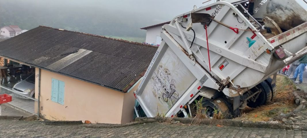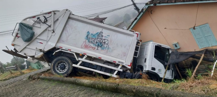Um grave acidente foi registrado por volta das 5h da manhã desta quarta-feira (4), na Rua Bahia, no bairro Bussolo, em Orleans. Um caminhão da coleta de lixo da prefeitura perdeu o controle em uma via escorregadia por conta da chuva e colidiu violentamente contra a parede de uma residência.