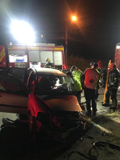 Um veículo e um acaminhão bateram de frente. Ao chegar no local, os bombeiros encontraram uma mulher no interior do veículo, estável, com sinais vitais normais, sem ferimentos graves, necessitando de abertura de acesso para sair do carro. O acesso foi obtido, com a retirada da porta do motorista, realizada pelas duas equipes de resgatistas.