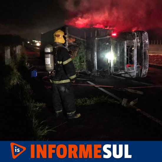 Depois de estourar um pneu o motorista perdeu o controle e tombou na rodovia, ocasionando o incêndio.