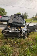 Segundo populares relataram a vítima se perdeu e capotou o veículo várias vezes vindo a parar na rodovia e que já estava desacordado. Foto: BVJ Um grave acidente foi registrado hoje por volta das 14h30min na localidade da Rodovia SC 100 Claudino Abel Botega, no balnério Camacho em Jaguaruna.