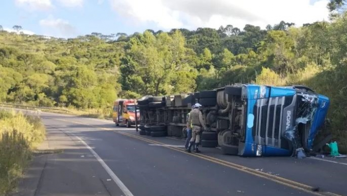 Um caminhão carregado de maçãs, tombou em um acidente de trânsito ocorrido no km 279 da rodovia SC – 114, por volta das 15h50, nesta terça-feira (28), em São Joaquim. O motorista da camionete SCANIA/R450 A6X2 com placas de Arroio Trinta, era um homem de 36 anos e sofreu ferimentos leves. A guarnição da Polícia Militar Rodoviária (PMRV) de Painel, foi acionada para atender a ocorrência.
