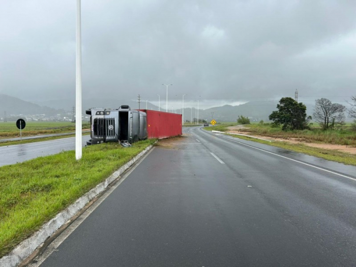 Na tarde desta terça-feira, dia 31, uma carreta tombou no km 2,300 da rodovia Ivane Fretta, na SC-370, em Tubarão. O motorista, um jovem de 22 anos, perdeu o controle do veículo, segundo informações da Polícia Militar Rodoviária (PMRv), levando ao acidente.