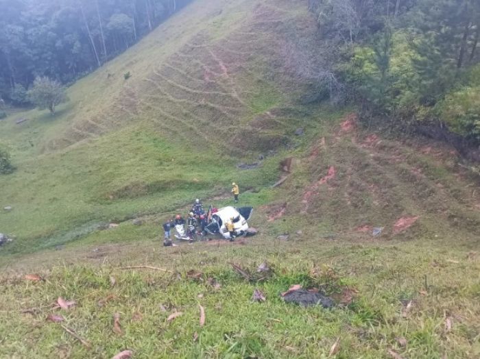 Carro com duas pessoas perde controle e cai de ribanceira de 20 metros — Foto: Corpo de Bombeiros/Divulgação