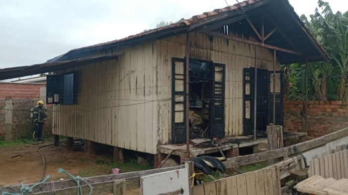 Uma casa de madeira, com aproximadamente 60 metros quadrados, foi totalmente destruída por um incêndio na tarde desta segunda-feira (10), no bairro Passagem, em Tubarão.