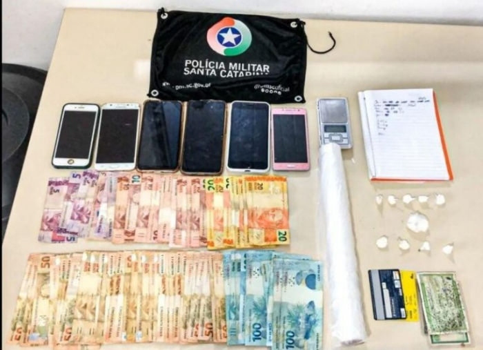 Ao conversarem com o casal, suspeitas forma levantadas em relação a residência de ambos. Segunda a PM, os policiais entraram e realizaram buscas no interior da residência onde foram encontradas porções de cocaína, balança de precisão, caderno de anotações referente ao tráfico e materiais utilizados para preparação de drogas, além de R$ 2.845 reais em dinheiro.