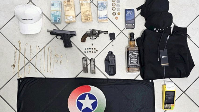 Durante a abordagem, foram apreendidos: uma pistola carregada, um revólver com uma munição, um carregador sobressalente com 11 munições, roupas, bonés, pingentes, anéis, correntes, uma garrafa de uísque, um celular e cerca de R$ 36.339,65 em espécie.