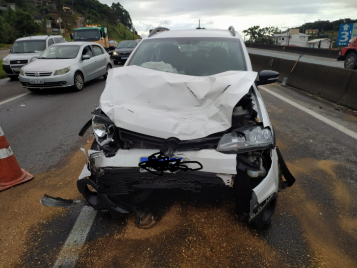 Duas pessoas ficaram feridas após colisão traseira envolvendo um VW/Fox e um Toyota/Yaris. O acidente foi registrado por volta das 11h, no km 229 da BR-101 em Palhoça, sentido norte. Motorista do Yaris e um passageiro do Fox sofreram lesões graves (fraturas) e foram levados ao hospital.