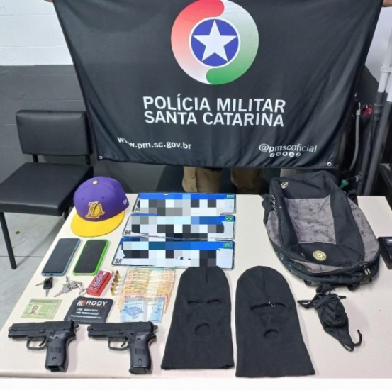 No interior do veículo, foram encontrados objetos relacionados a atividades criminosas, incluindo balaclavas, simulacros de arma de fogo, celulares, placas de carros e uma quantia em dinheiro. Com os dois primeiros homens abordados, foram encontradas munições de calibre 32 e dinheiro. A arma de fogo mencionada pelos policiais não foi localizada, levantando a possibilidade de que o suspeito a tenha descartado durante a fuga. Todos os envolvidos foram conduzidos à Delegacia de Polícia Civil para os procedimentos legais.