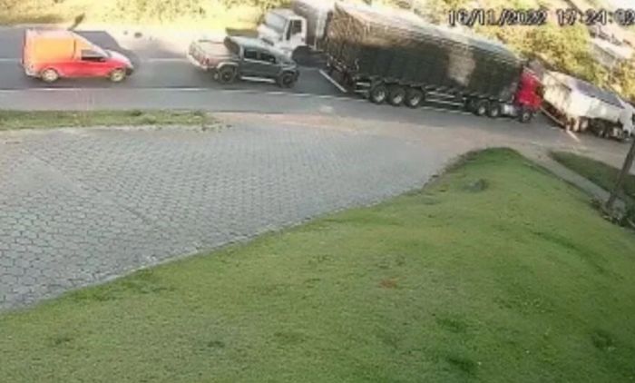 Imagens de uma câmera de videomonitoramento registraram o momento do atropelamento. O menino passa pedalando entre dois caminhões que estavam parados em uma fila na rodovia e, quando tenta atravessar a outra pista, é atingido por outro caminhão que vinha em sentido contrário. Com o choque, ele foi arremessado por alguns metros.