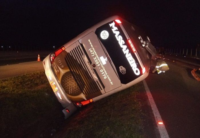 Já por volta das 3h28min desta madrugada, o Corpo de Bombeiros Militar de Laguna (ABTR 94 e ASU 295) foi acionado para atender um acidente de trânsito, na BR-101, no bairro Caputera, sentido Norte-Sul, também em Laguna, onde um ônibus de turismo da empresa Massaneiro, de Joinville com 54 ocupantes, saiu da pista e quase tombou na margem da rodovia. Uma mulher ficou com o braço preso entre a coluna lateral e o solo, sendo necessário o desencarceramento.