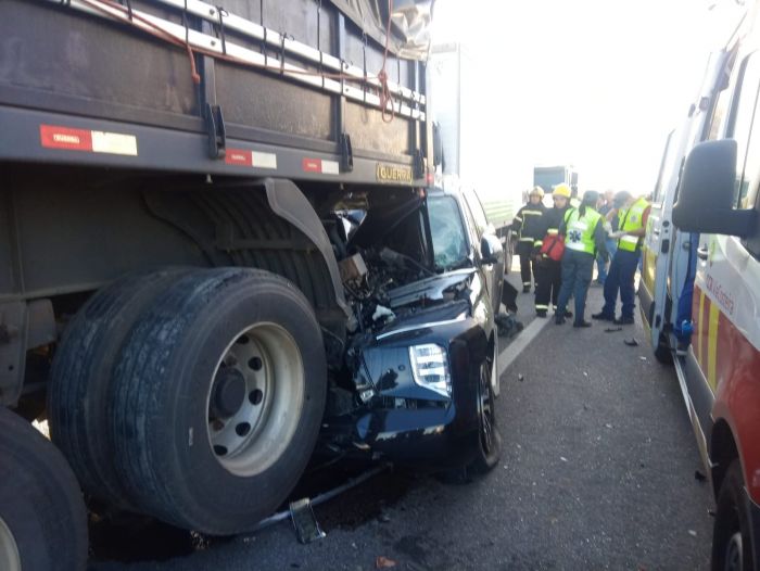 O Mitsubishi ficou prensado na traseira de um dos caminhões, o acidente provocou longa fila na BR. Foto: BM No fim da tarde de ontem por volta das 17 horas, o Corpo de Bombeiros Militar de Laguna atendeu uma ocorrência de acidente de trânsito grave na BR-101, bairro Laranjeiras, em Laguna. No acidente foram envolvidos dois caminhões e dois veículos.