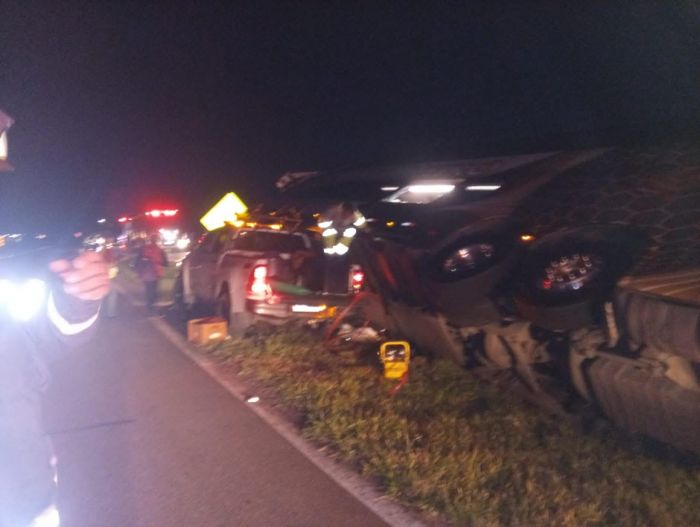 Uma ocorrência foi no fim da tarde de ontem envolvendo dois caminhões e dois veículos. Na madrugada um ônibus de turismo saiu da pista e tombou na margem da BR.
