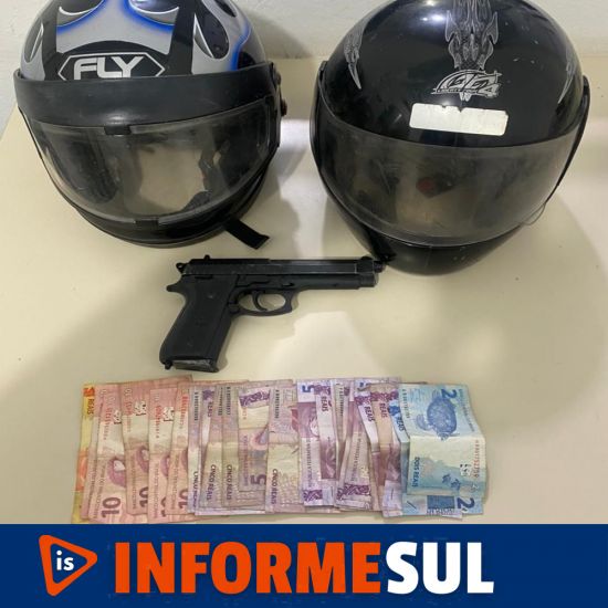 Os dois suspeitos foram abordados, e com um dos suspeitos, em revista pessoal foi localizado em sua cintura um simulacro de pistola semelhante à arma utilizada para cometer os crimes durante o dia, além da quantia de R$169,00. Com o segundo abordado que trajava vestes iguais aos do motorista da motocicleta que realizou os assaltos durante o dia, nada de ilícito foi localizado.