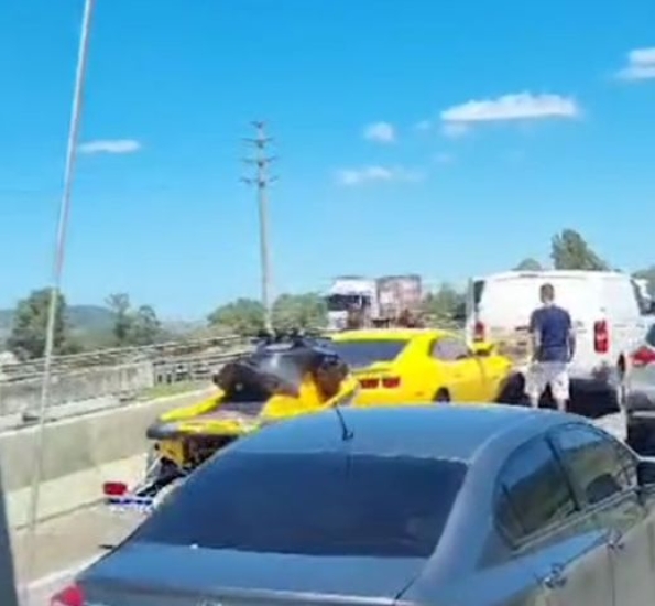Um engavetamento envolvendo quatro veículos, incluindo um Camaro amarelo com reboque de jet ski, chamou a atenção de motoristas e passageiros na BR-101, em Sangão, no começo da tarde desta quarta-feira (5)