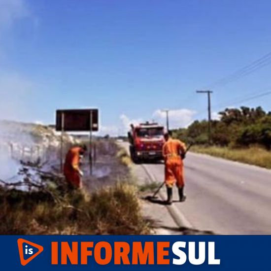 Ainda ontem pela manhã os Bombeiros já haviam combatido chamas nas margens da Rodovia no Balneário Esplanada em Jaguaruna. A solicitação foi realizada pela própria PM pois a fumaça oferecia risco ao trânsito no local.