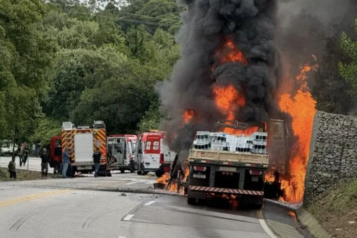 A colisão ocorreu por volta das 13h, no km 28 da rodovia, quando um caminhão carregado com madeira tombou em uma curva acentuada, pegou fogo e acabou atingindo outros cinco veículos — entre eles dois caminhões e quatro automóveis. Dois desses carros tinham placas de Palhoça e Tijucas.