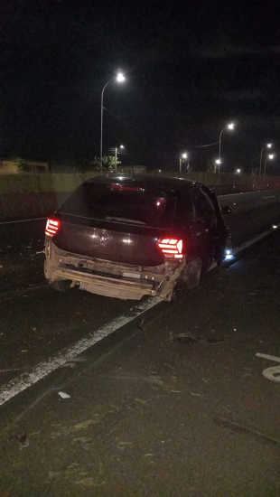 Ao chegar no local, a guarnição encontrou o veículo envolvido no acidente parado no meio da pista, em um trecho com pouca iluminação, representando um risco adicional. O motorista, já fora do carro, foi encontrado sentado no acostamento, com cortes na cabeça, hemorragia e sinais de possível fratura no nariz. Ele também relatou dores no ombro direito e apresentava sinais de confusão, com falas repetitivas.