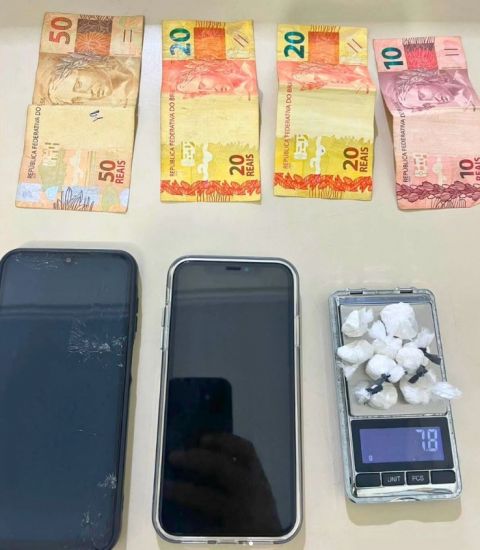 Durante a abordagem, foram encontrados dois celulares e R$100 em dinheiro com o suspeito. Ao realizarem buscas no local onde o objeto foi jogado, os policiais localizaram nove buchas de cocaína, totalizando 7,8 gramas, todas prontas para venda.