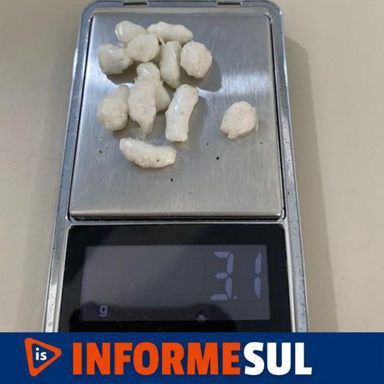 Ao realizarem buscas no local observado onde o suspeito buscava algo, foi localizado um pacote contendo 3,1 gramas de crack distribuídas em 12 pedras do entorpecente.