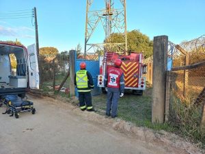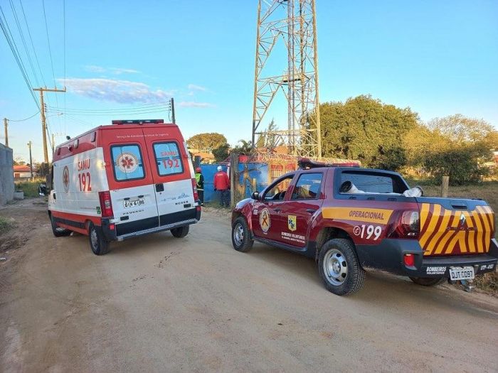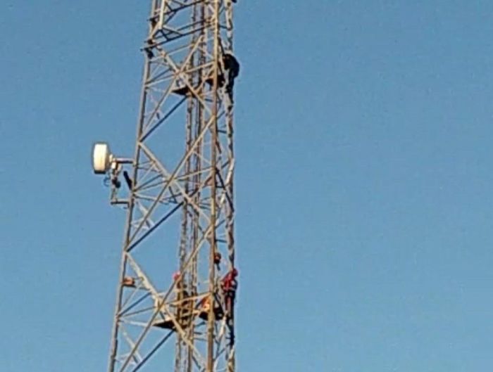 Após três horas de negociação a confiança foi estabelecida e o mesmo aceitou descer acompanhado dos bombeiros. Foto: BVJ Os bombeiros voluntários de Jaguaruna atenderam uma ocorrência hoje por volta das 15 horas no bairro Riachinho em Jaguaruna. A solicitação foi realizada por populares que se encontravam em um estabelecimento em frente a torre de telefonia e informaram que um homem de 33 anos de idade teria subido na estrutura sem equipamentos de segurança.