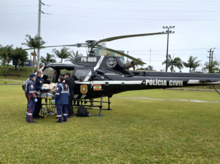 Após estabilização, o paciente foi transferido de helicóptero ao Hospital São José, em Criciúma, onde passou por exames de imagem e seguirá sob acompanhamento médico especializado.