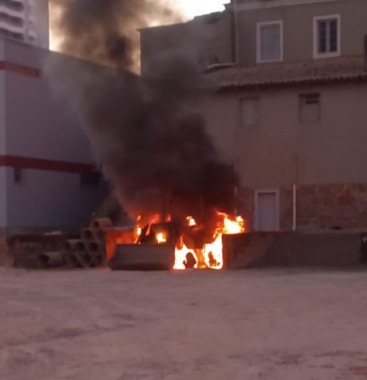 Um incêndio destruiu uma retroescavadeira por volta das 18h30 desta quarta-feira, dia 13, na avenida Chapecó, no Centro de Cocal do Sul. Ao chegar ao local, a equipe do Corpo de Bombeiros encontrou a máquina, pertencente à proprietária, envolta pelas chamas.