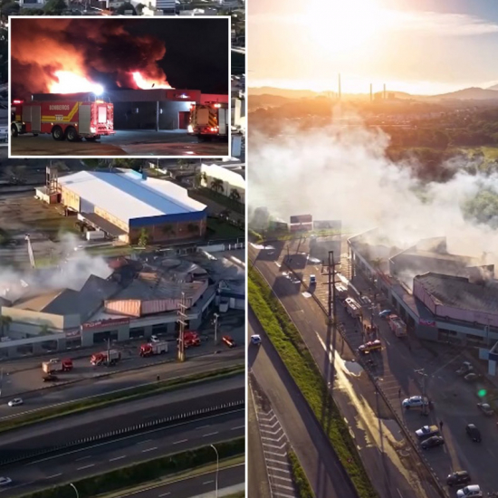 Drones Sul Um incêndio de grandes proporções destruiu a loja de atacado Top Brasil, localizada às margens da BR-101, em Tubarão. O incêndio começou por volta das 23h desta sexta-feira (24) e, felizmente, não houve vítimas. Segundo informações extraoficiais, o fogo teve início na lanchonete ao lado do estabelecimento e se propagou rapidamente para outras partes da loja.