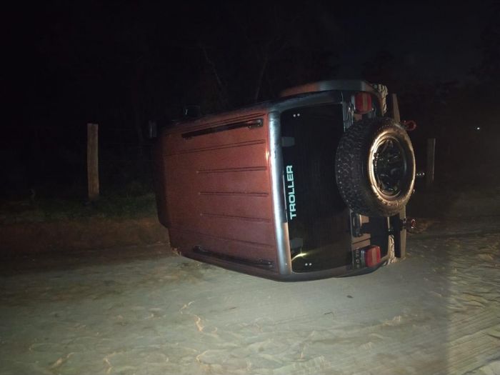 O carro foi encontrado capotado e sem nenhuma vítima no local. As circunstâncias do acidente serão apuradas pela PM. Foto: BVJ Bombeiros Voluntários atenderam uma chamado de capotamento no fim semana passado, na Estrada Geral Arroio Corrente em Jaguaruna. Ao chegar no local a guarnição encontrou um Jeep Troller com placas de Garopaba-SC capotado na pista, porém sem a vítima.