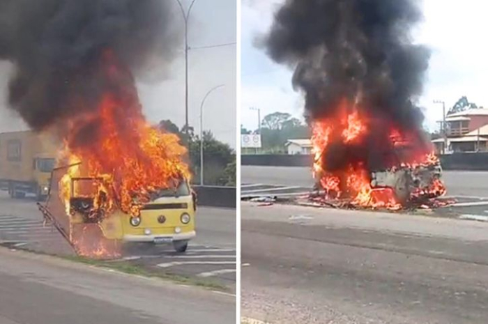 Uma Kombi ficou completamente destruída após pegar fogo no fim da manhã desta terça-feira (9), na BR-101, no bairro Guaiúba, em Imbituba.
