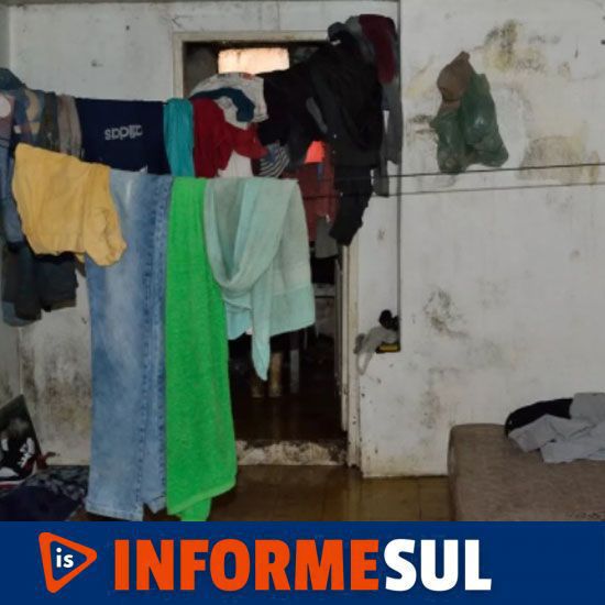 Nos alojamentos, os trabalhadores faziam as refeições sentados no chão ou sobre os colchões. Já nas frentes de trabalho, os donos das plantações disponibilizavam almoço em refeitório que contava com banheiro. Foto: Divulgação Auditores fiscais do trabalho, que integram o Ministério do Trabalho e Previdência, resgataram 49 pessoas que foram vítimas de tráfico de pessoas e submetidas a condições de trabalho análogas à escravidão em três propriedades de cultivo de maçã, em São Joaquim, na Serra. Os trabalhadores foram encontrados em alojamentos insalubres a afirmaram ter pago pela alimentação, moradia e deslocamento durante os dias de serviço.
