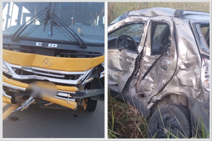 Colisão envolveu veículo escolar e carro. Condutor e passageiro de automóvel foram hospitalizados