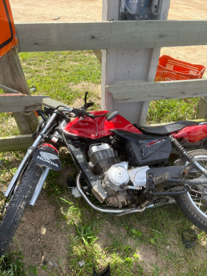 Ao chegarem ao local da ocorrência, os Bombeiros Voluntários encontraram o motociclista caído na via, apresentando uma fratura exposta no membro inferior esquerdo, além de um corte superficial no membro superior direito.