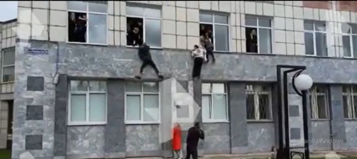 Outras imagens mostram estudantes fugindo dos tiros e pulando pelas janelas do primeiro andar de um prédio do campus, que fica na região dos Urais.
